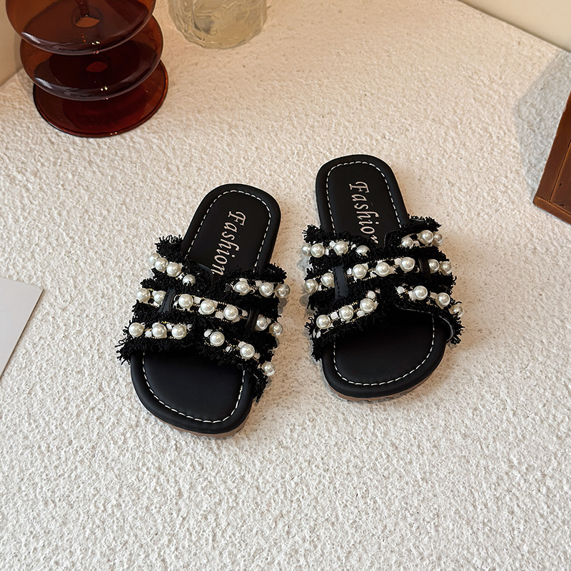 新款 外穿2025夏季 儿童软底百搭珍珠一字拖 小香风平底拖鞋 女童时尚