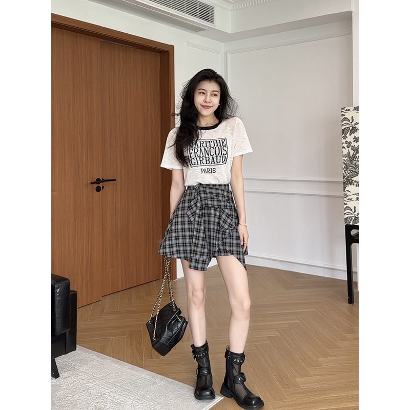 竹节麻针织短袖 格子裙裤 T恤 半身裙两件套装 张阿星 女夏季 短款