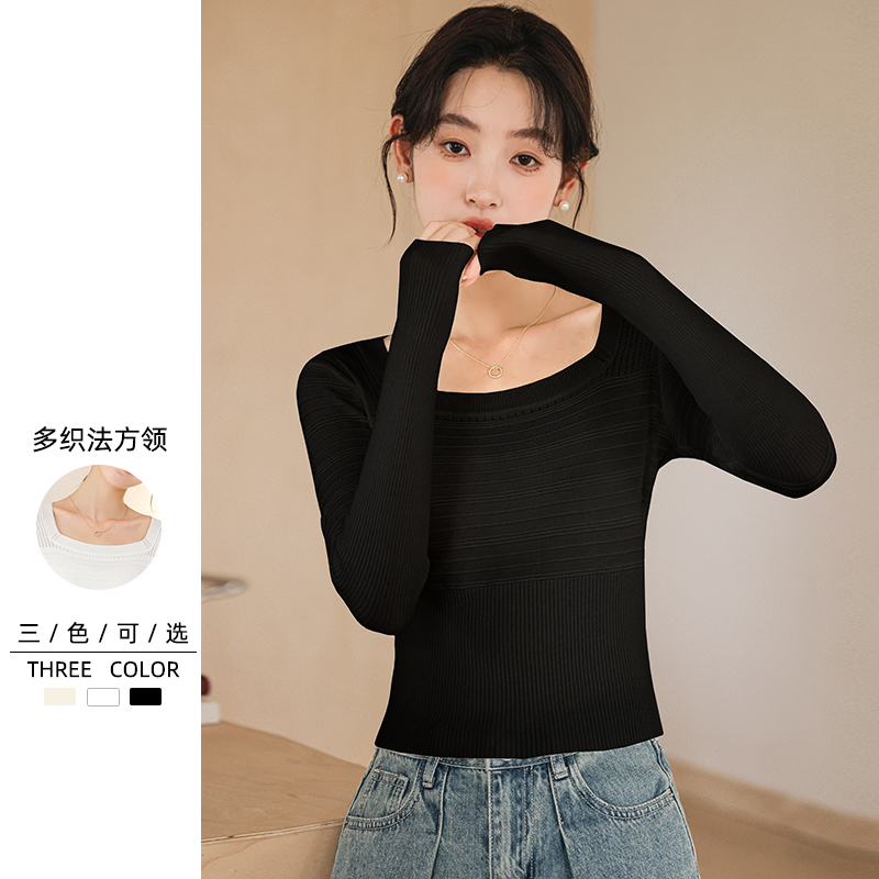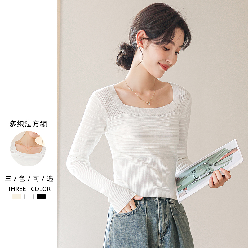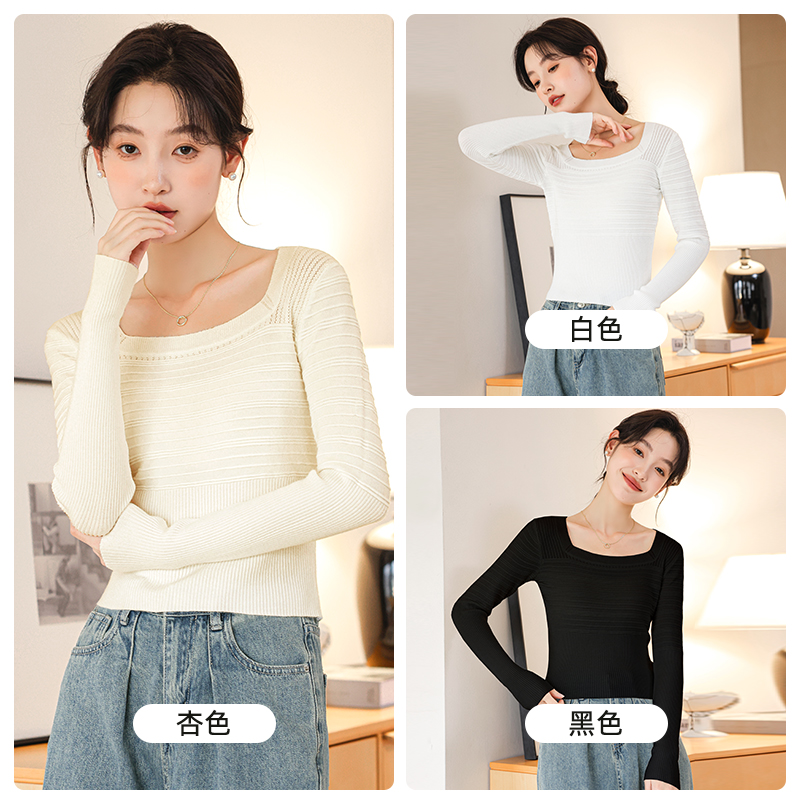毛衣高级感长袖 方领镂空针织衫 短款 气质修身 女开春穿搭内搭打底衫
