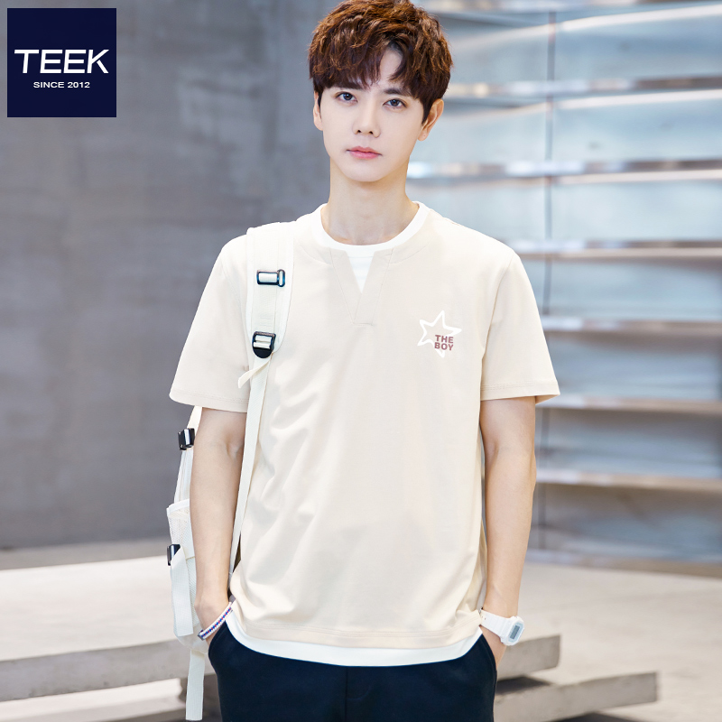 米色体恤上衣 T恤男V领五角星印花韩版 TEEK2025夏季 假两件速干短袖