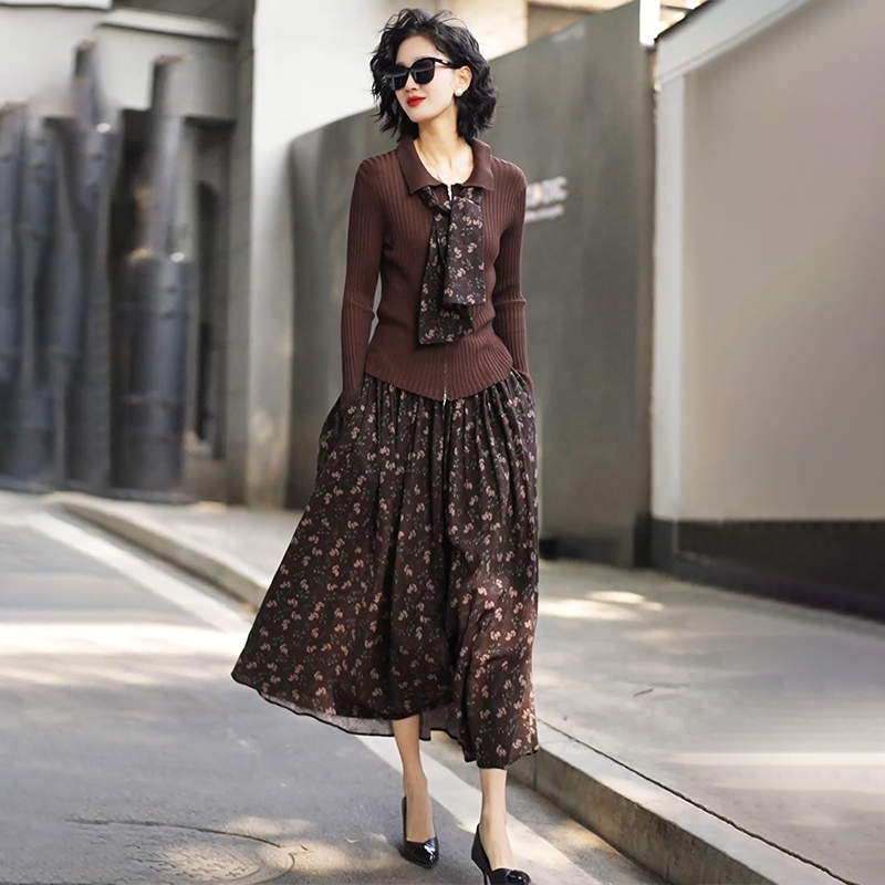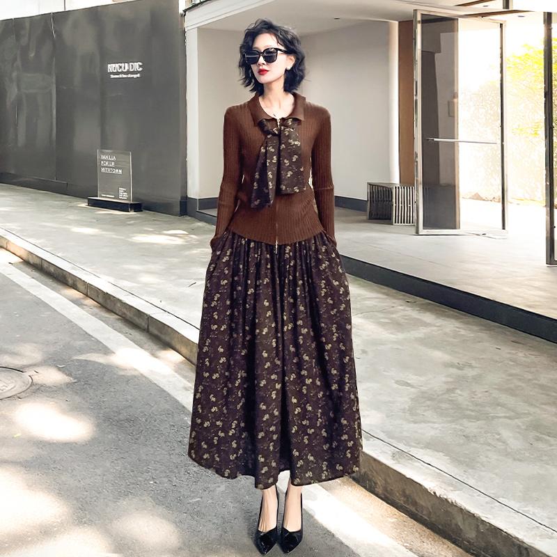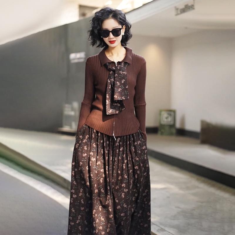新款 裙女2025春季 咖色洋气减龄气质两件套 套装 复古文艺小碎花时尚