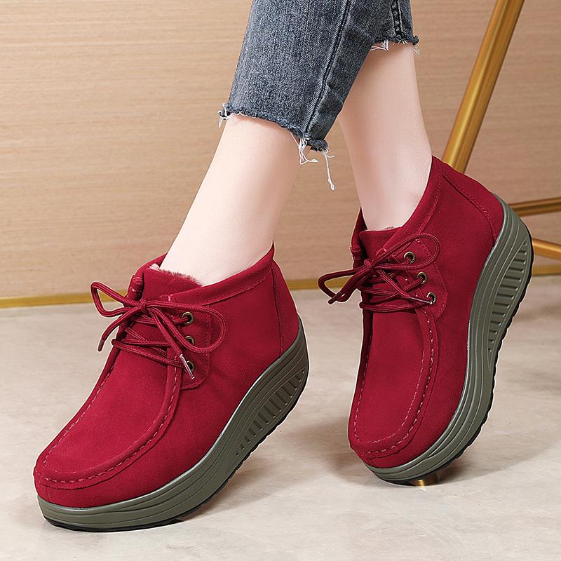 加绒松糕中年妈妈女鞋 冬季 女厚底坡跟雪地靴棉鞋 真皮高帮鞋 短筒鞋