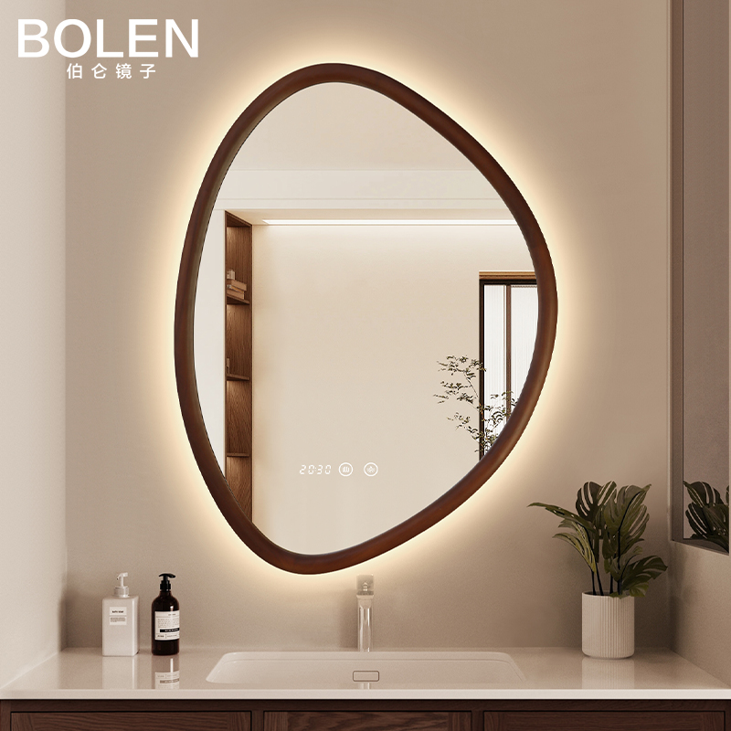 BOLEN实木不规则装 饰浴室镜LED发光智能镜子卫生间壁挂胡桃木色镜