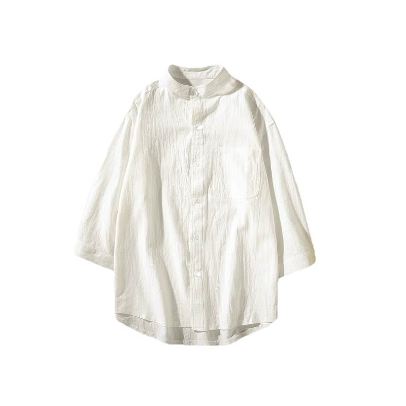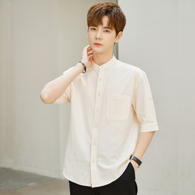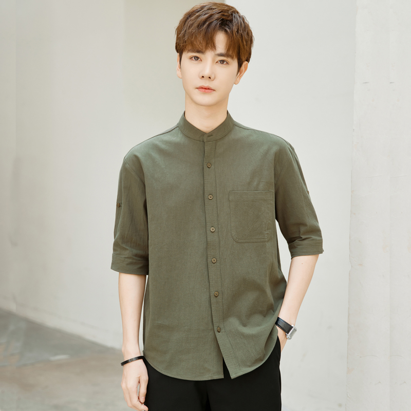 中袖 男无领纯棉夏季 寸衫 休闲韩版 衬衣 短袖 宽松立领潮牌五分袖 衬衫
