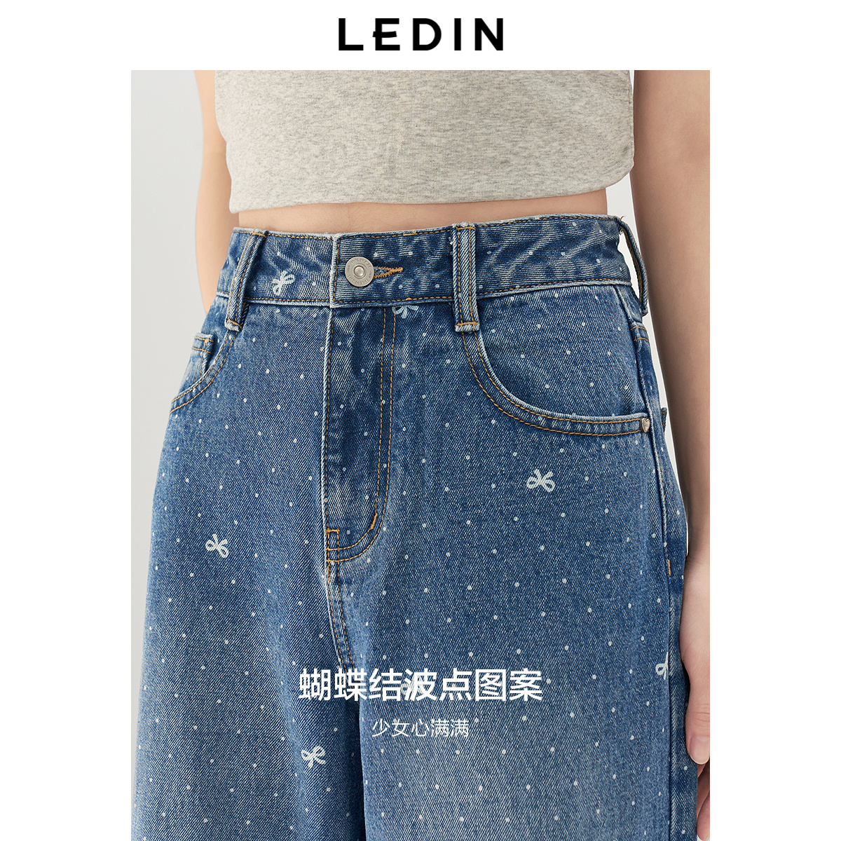 2025秋季 阔腿裤 新款 高腰窄版 子 直筒长裤 乐町蝴蝶结波点图案牛仔裤