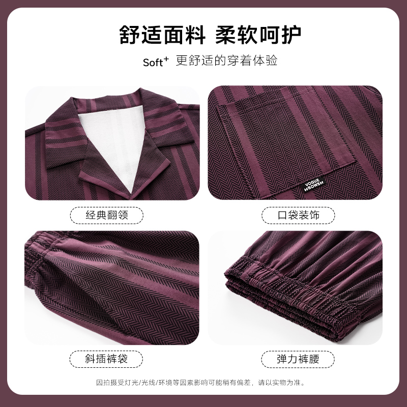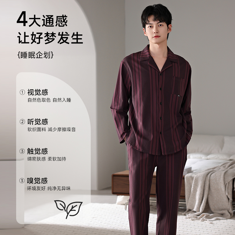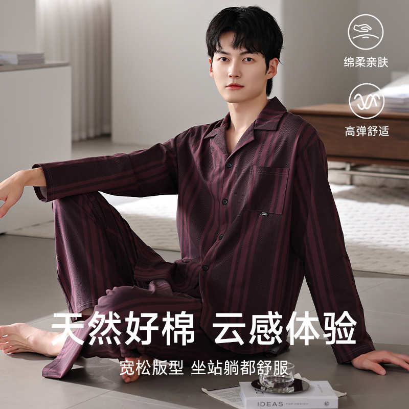 高级简约男士 猫人纯棉睡衣男春秋冬款 套装 长裤 条纹家居服 全棉长袖