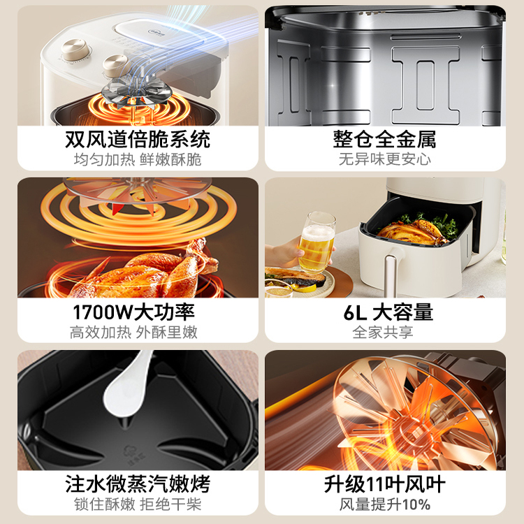 美 一体电烤箱空气电炸锅 空气炸锅家用6L大容量金属烤箱2025款