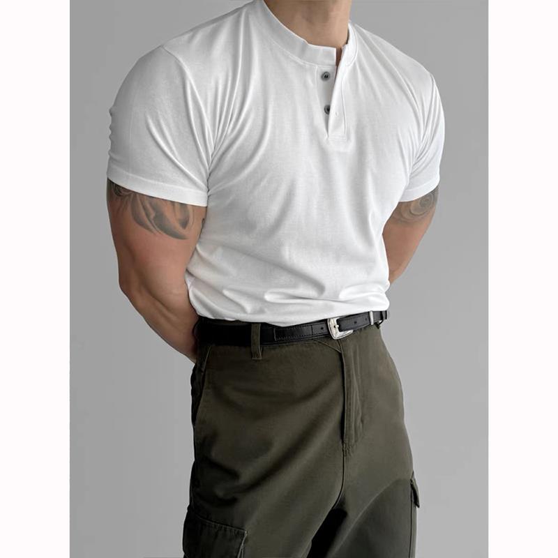 上衣 T恤男高级感弹力健身排扣短宽半袖 硬汉风白色亨利领修身 短袖
