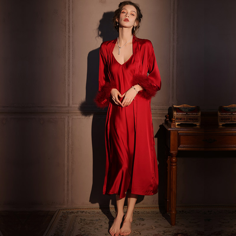 睡袍红色喜庆睡衣高级感婚用套装 长款 新娘晨袍女伴娘冰丝绸羽毛袖