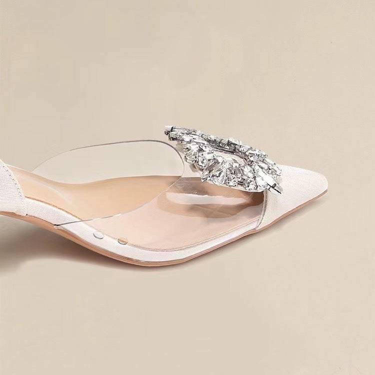 2025裸杏色透明方扣后空细跟包头凉鞋 女定制 职业面试尖头高跟单鞋