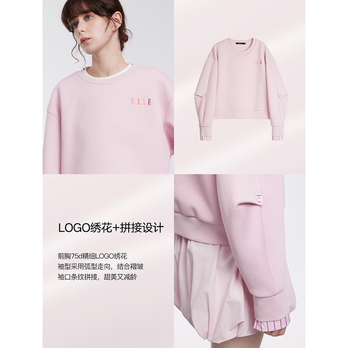 休闲时髦气质上衣 新款 ELLE粉色圆领长袖 宽松套头卫衣女2025秋季