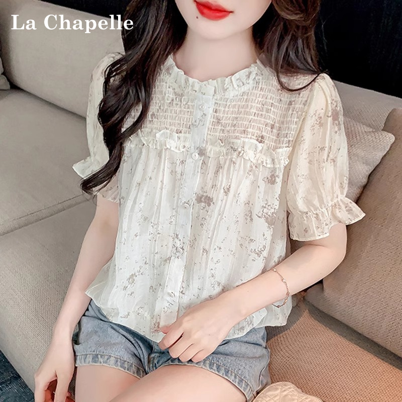 高级感漂亮小衫 拉夏贝尔木耳边碎花短袖 新款 女夏季 洋气上衣 雪纺衫