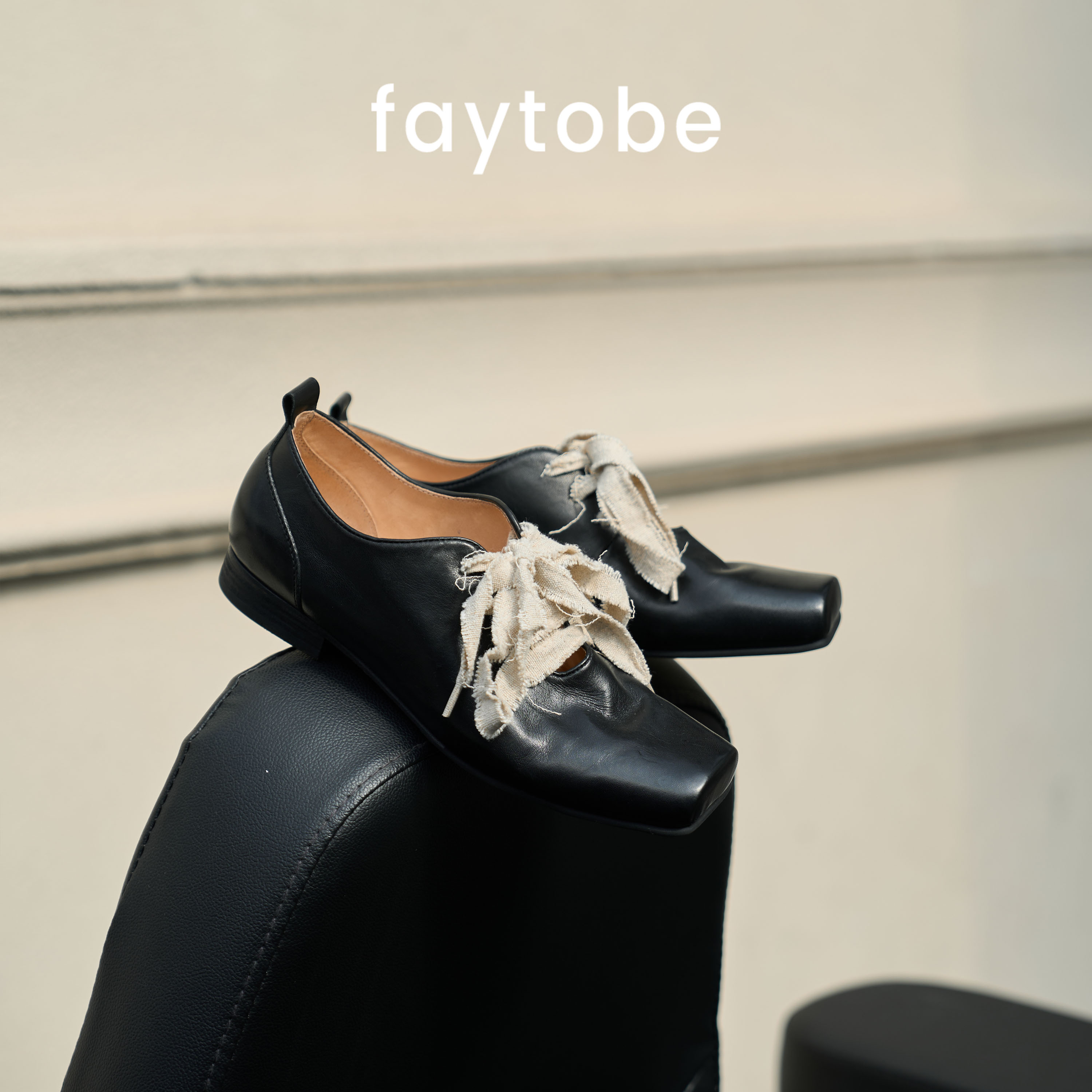 faytobe25早春复古手工方头系带芭蕾鞋 牛皮侘寂风深口丝带小皮鞋