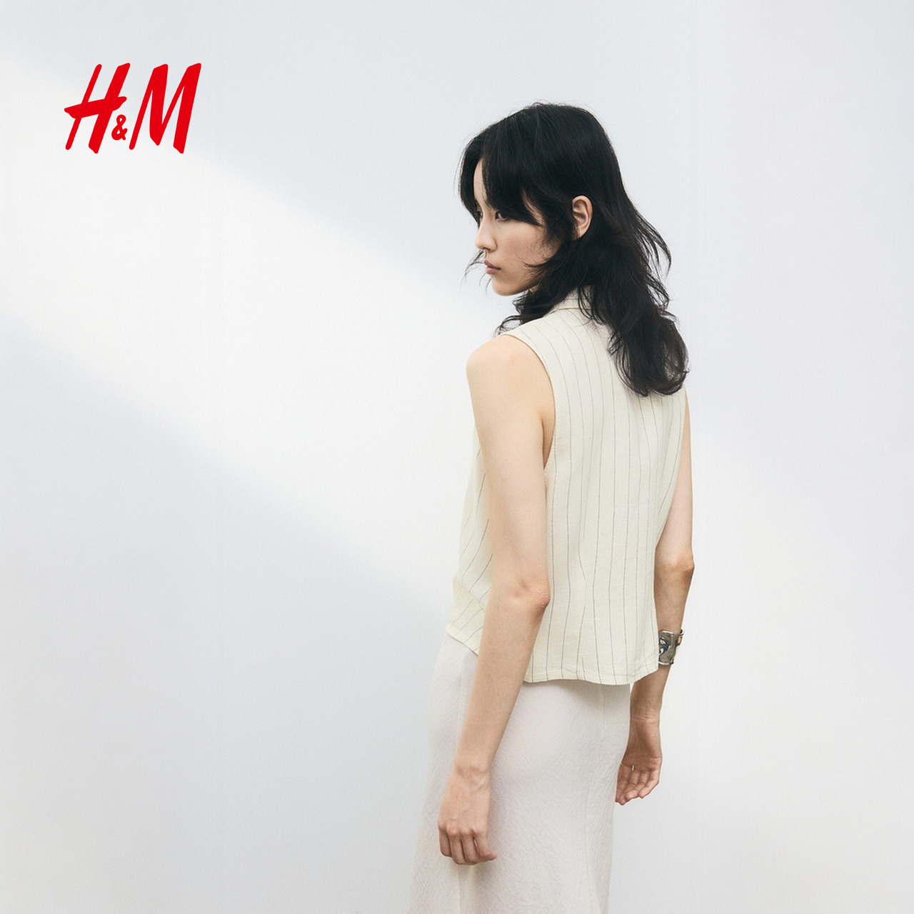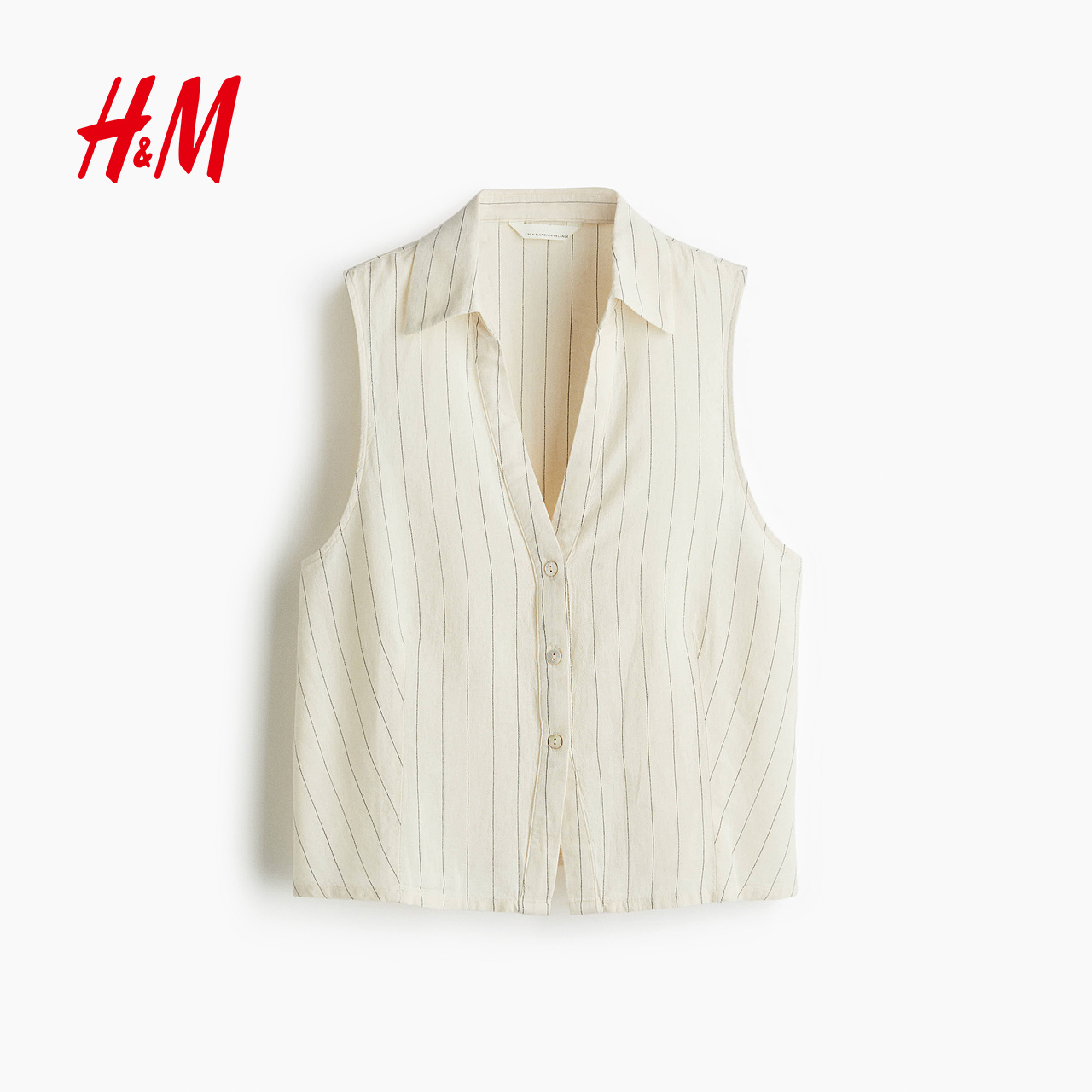 亚麻混纺翻领V领无袖 HM女装 新款 2025秋季 衬衣条纹上衣1289990 衬衫