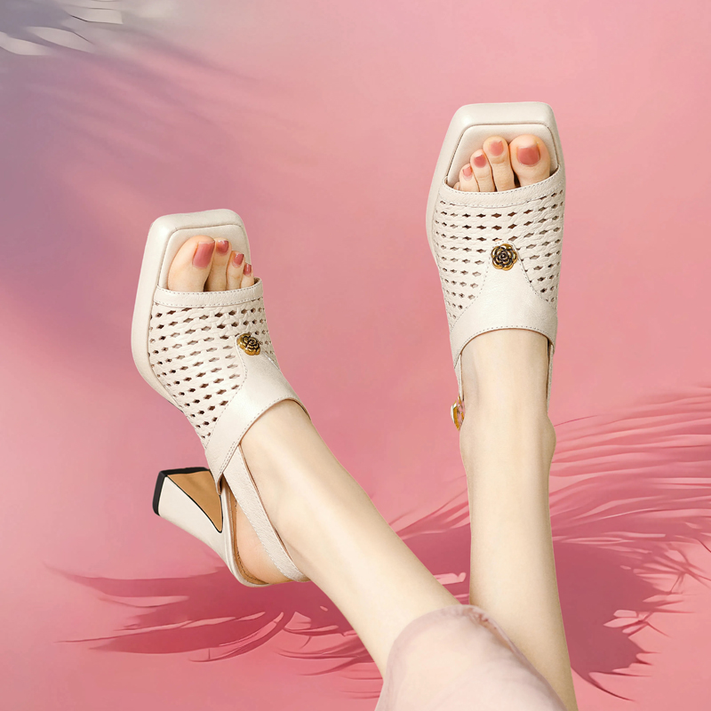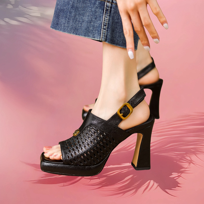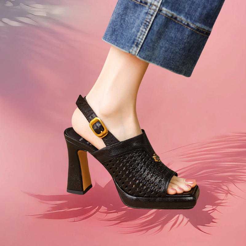方头防水台真皮气质高跟鞋 新款 2025夏季 女式 粗跟 编织镂空罗马凉鞋