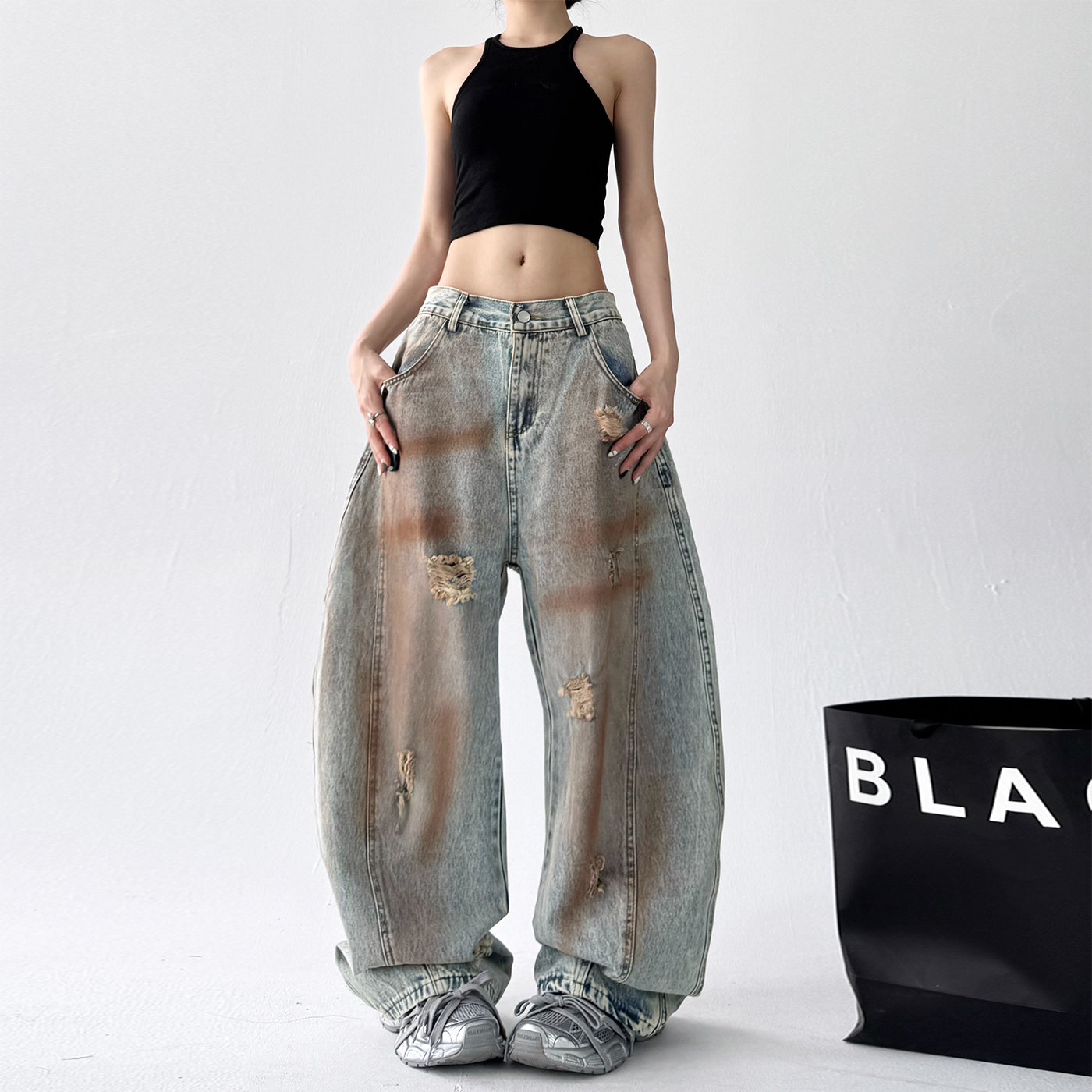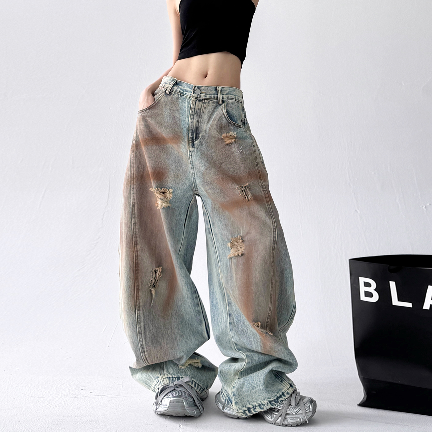女高街废土风宽松垂感拖地裤 复古磨洗做旧牛仔裤 子潮 美式 2025新款