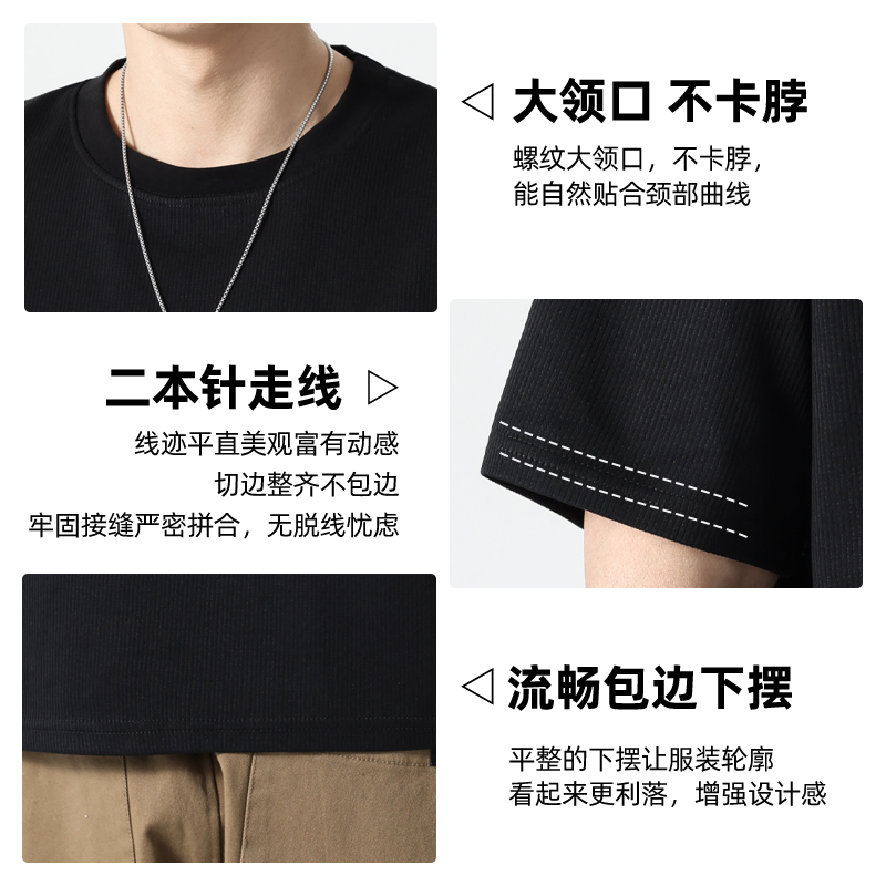 男装 条纹t恤男短袖 圆领白色休闲宽松潮胖子加肥加大大码 新款 夏季
