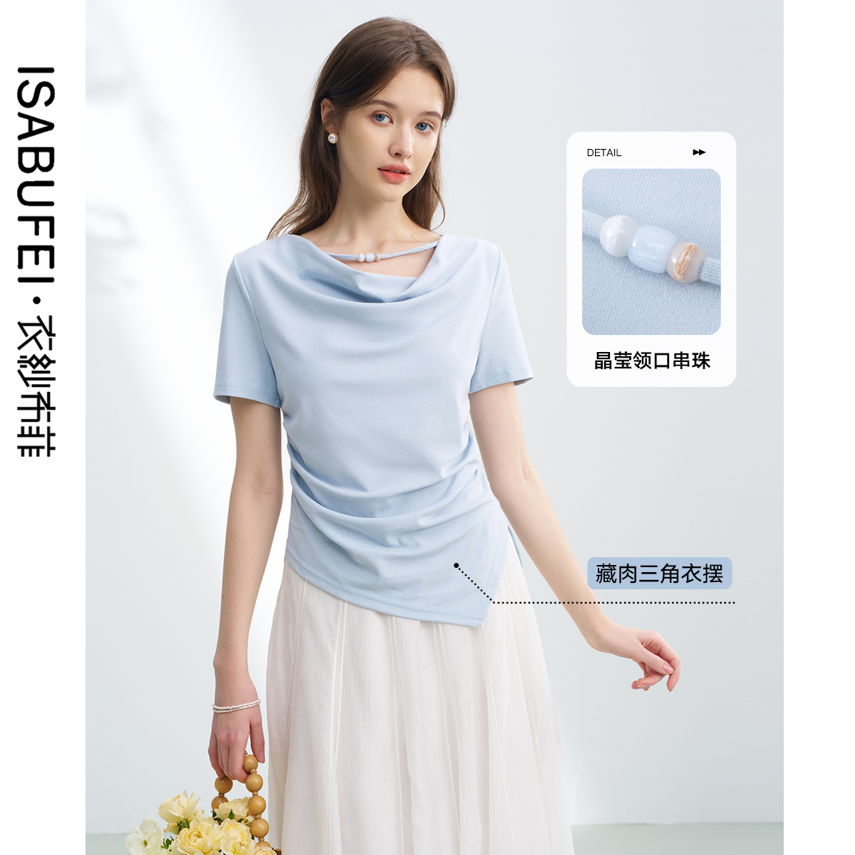 新款 针织T恤2025夏季 优雅显瘦上衣女 优雅堆堆领短袖 衣纱布菲云雅