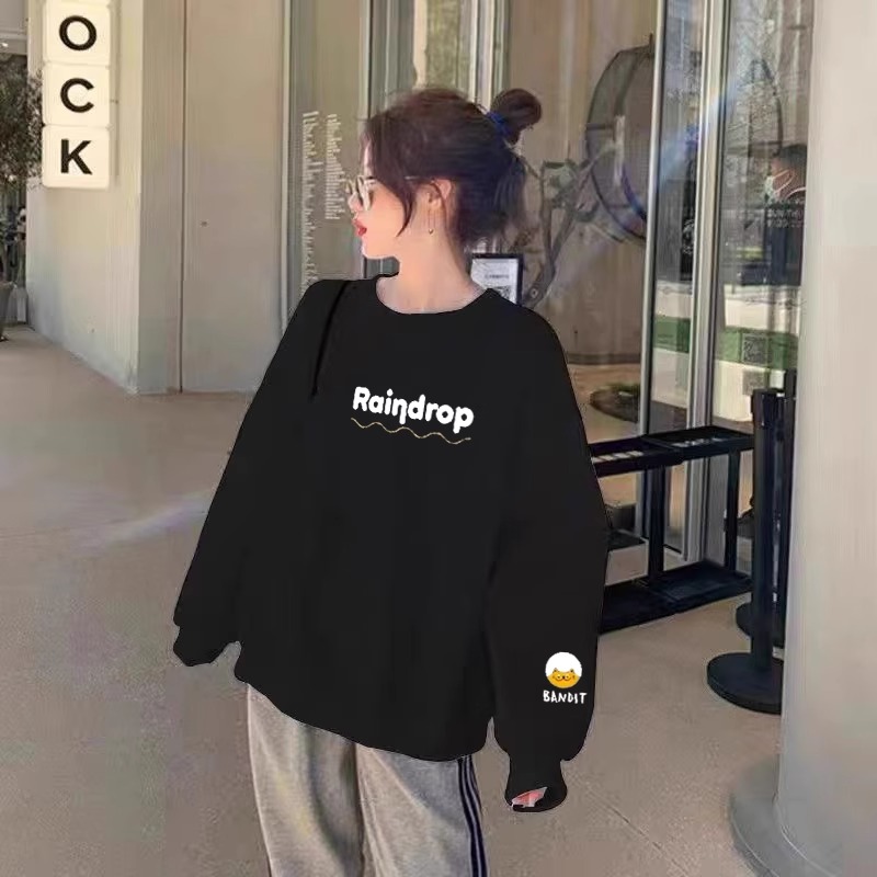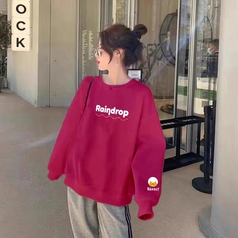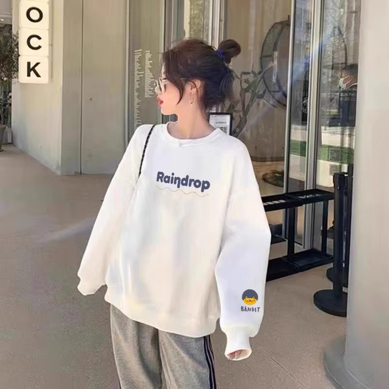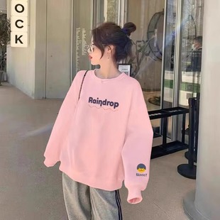 白色时尚 卫衣女韩版 印花加绒圆领外套潮 杏色宽松薄款 2025春秋新款