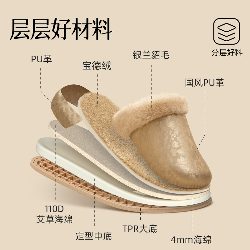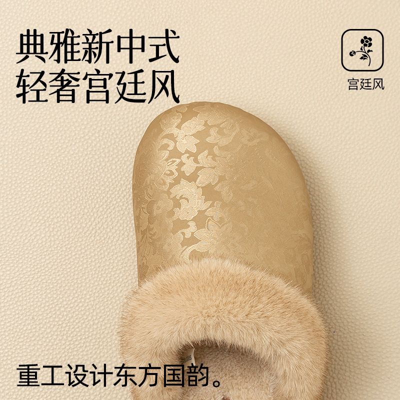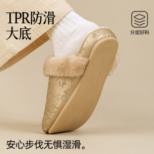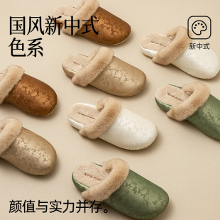 远港防水国风毛绒棉拖鞋 居家防滑厚底家居室内保暖加绒 女士秋冬季