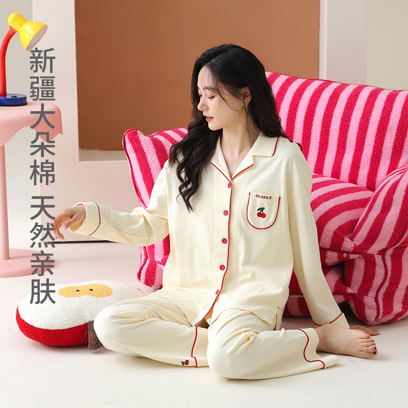 家居服可爱樱桃刺绣长袖 新一步 纯棉简约开衫 秋季 睡衣女 7A抗菌