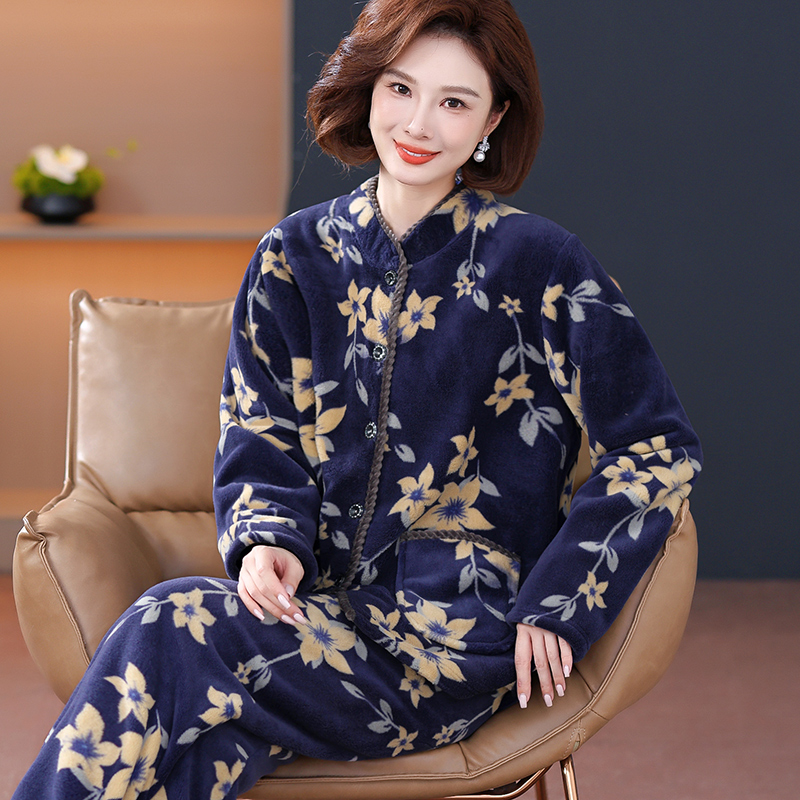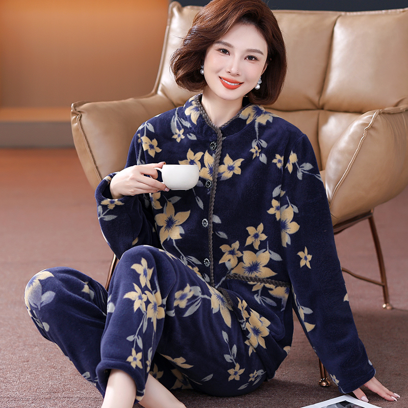 睡衣女秋冬中老年加厚套装 春秋婆婆珊瑚绒法兰绒 妈妈奶奶保暖长袖