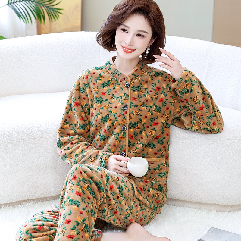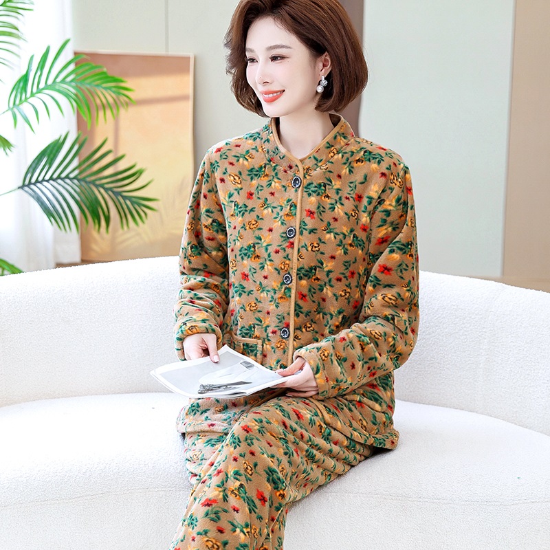 睡衣女秋冬中老年加厚套装 春秋婆婆珊瑚绒法兰绒 妈妈奶奶保暖长袖
