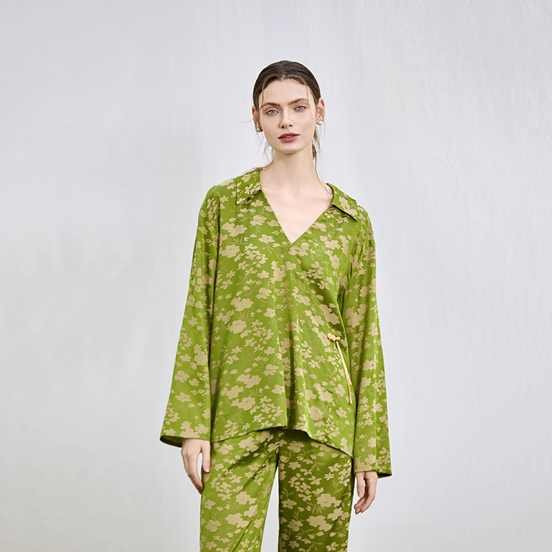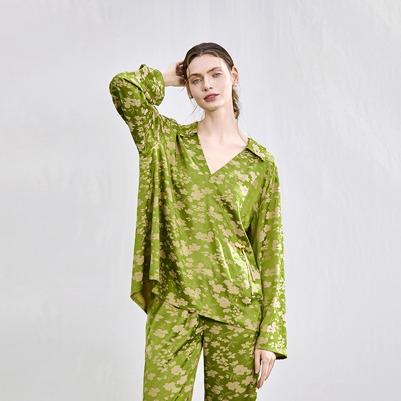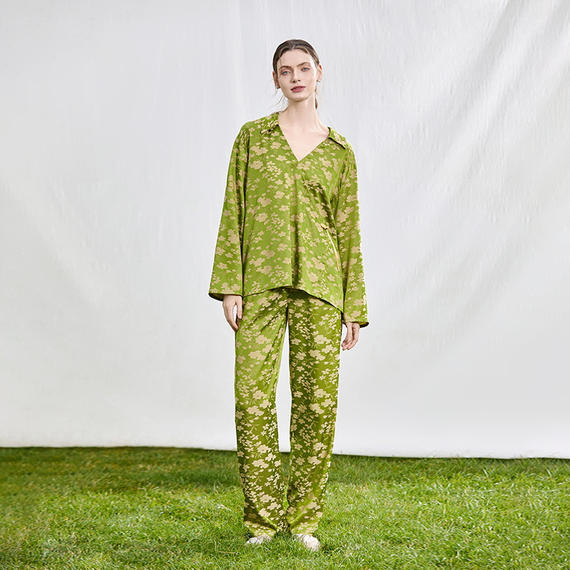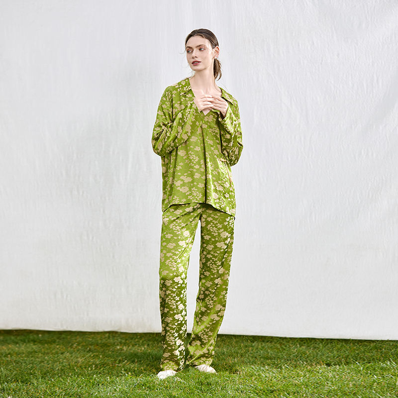 NoirTease春秋丝质印花睡衣女士复古V领长袖 可外穿 家居服两件套装