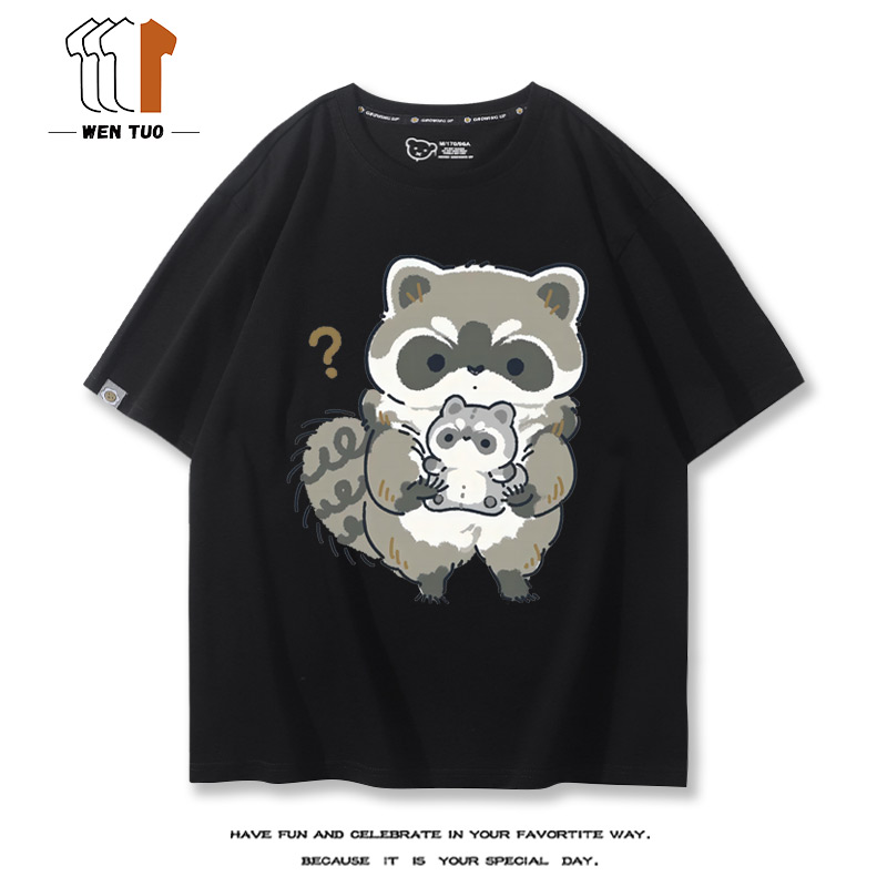 纯棉百搭半截袖 日系卡通小浣熊表情包Q版 夏季 T恤男女情侣装 短袖