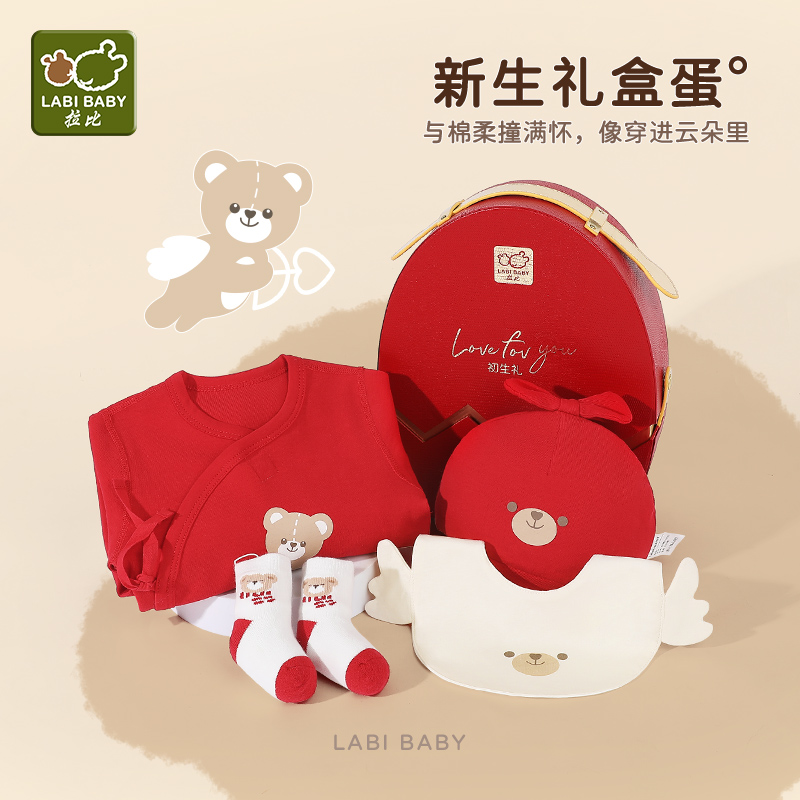 拉比初生儿满月宝宝礼物秋冬新品 新生家居4件送人新生儿红色礼盒