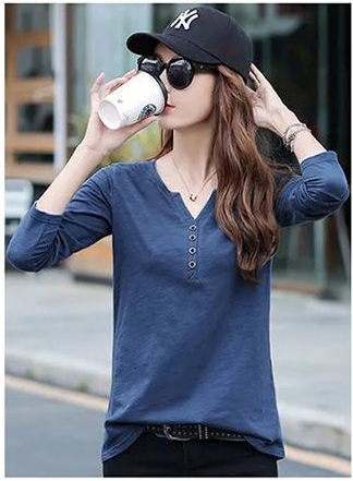 t恤女春装 百搭春秋上衣小衫 2025年新款 纯棉打底衫 宽松大码 V领长袖
