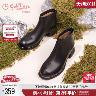 金利来女鞋 秋冬休闲百搭圆头软皮中跟女靴真皮黑色粗跟短靴女皮靴
