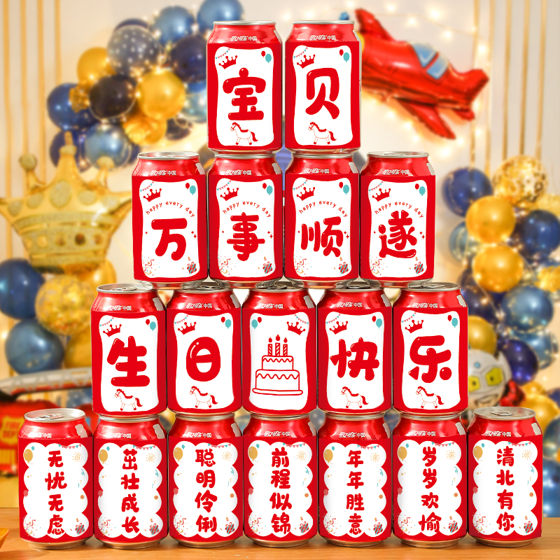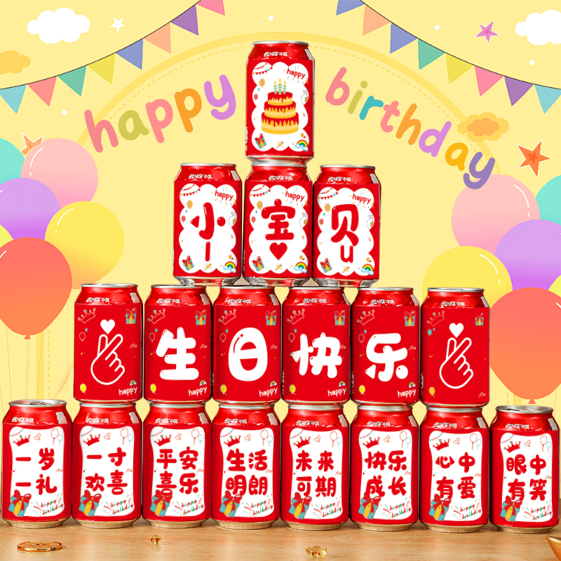 儿童生日快乐可乐贴纸定制饮料易拉罐周岁装 饰场景布置男女孩十岁