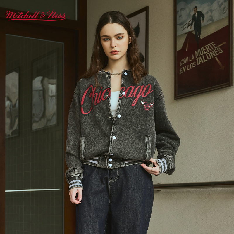 mitchell&nessNBA生活系列秋冬情侣立领牛仔夹克棒球服外套男女MN