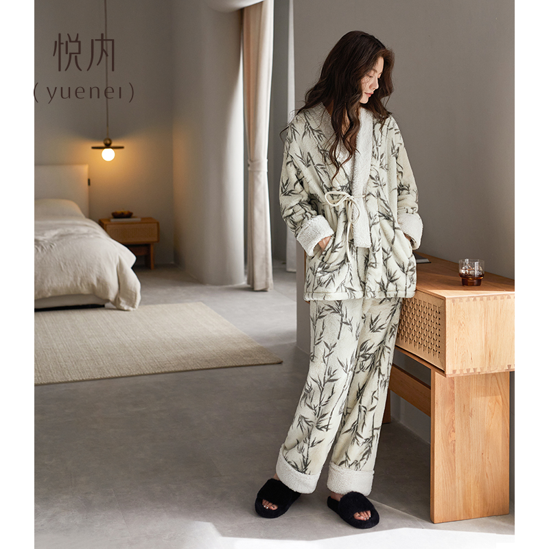 国风 法兰绒加绒加厚珊瑚绒家居服和服新中式 悦内睡衣女秋冬季 冬款