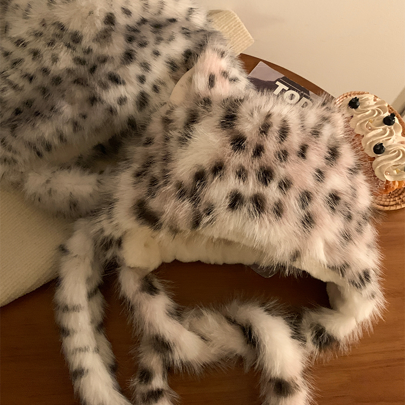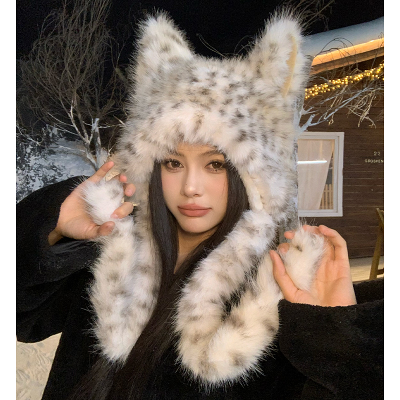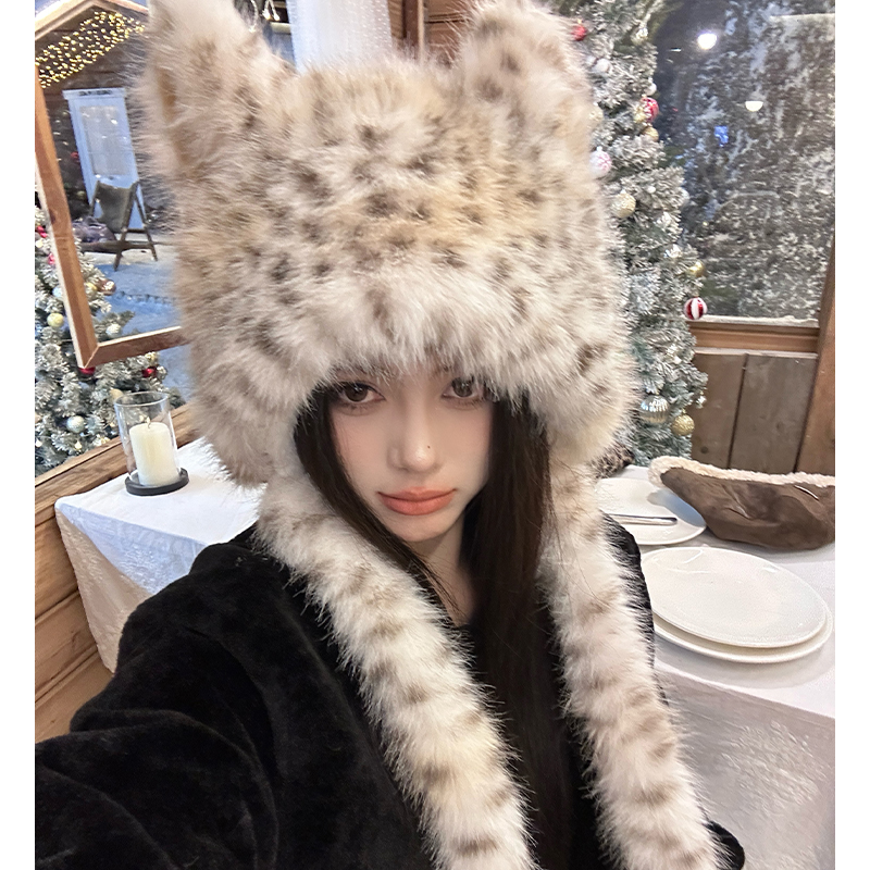 狐狸耳朵豹纹毛绒帽女冬季 可爱显脸小雷锋帽加厚防寒保暖护耳帽子