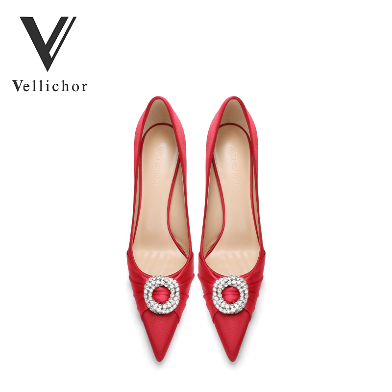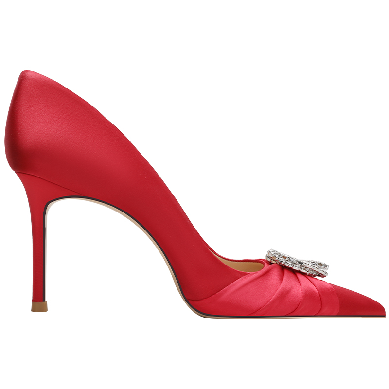 水钻扣缎面红色尖头新娘结婚不累脚秀禾高级感气质细跟高跟婚鞋 女