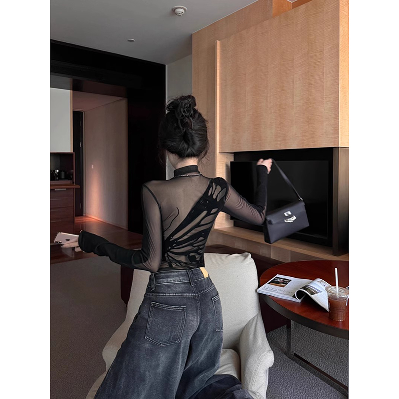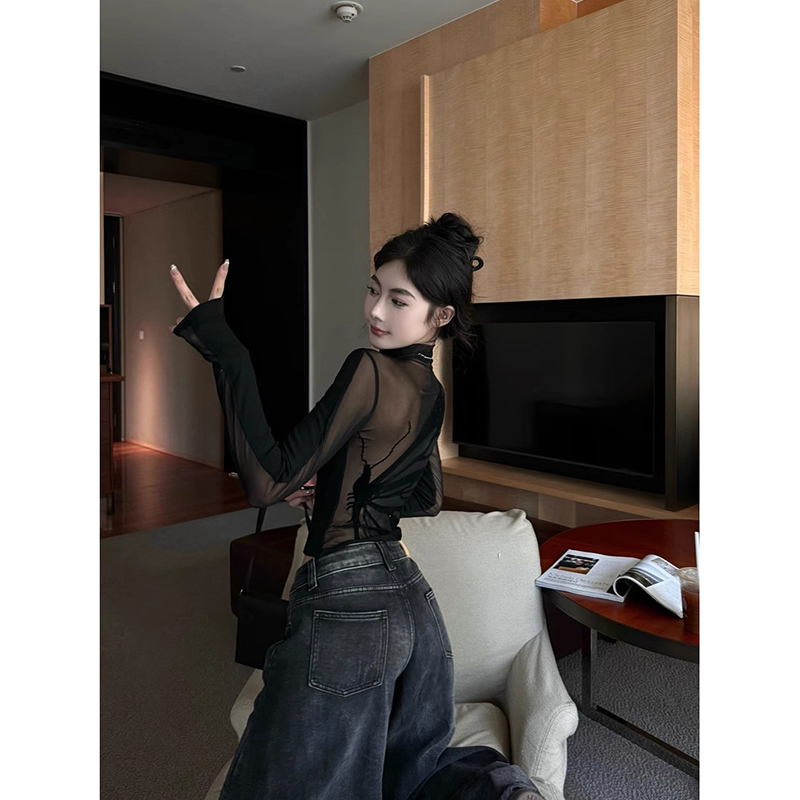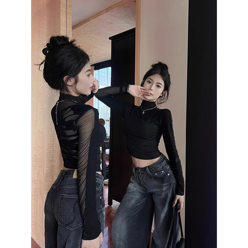 黑色微透印花高领打底衫 紧身辣妹内搭可外穿上衣 女秋冬2024年新款