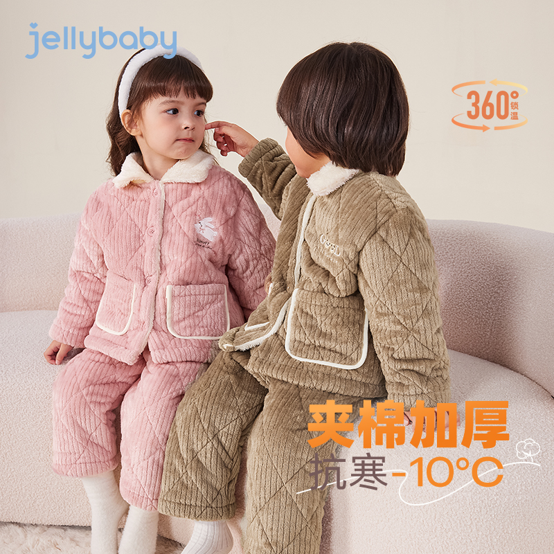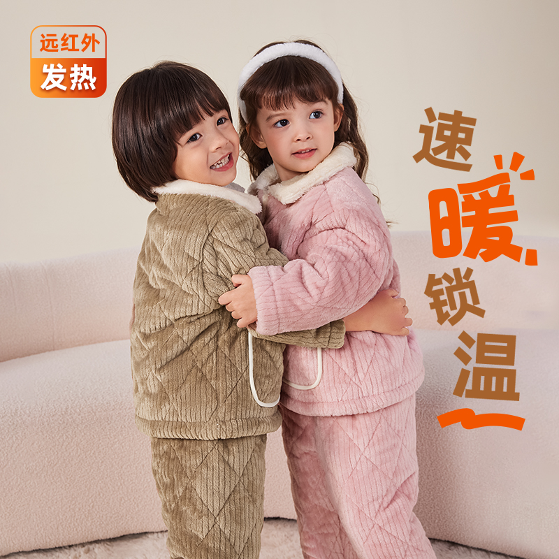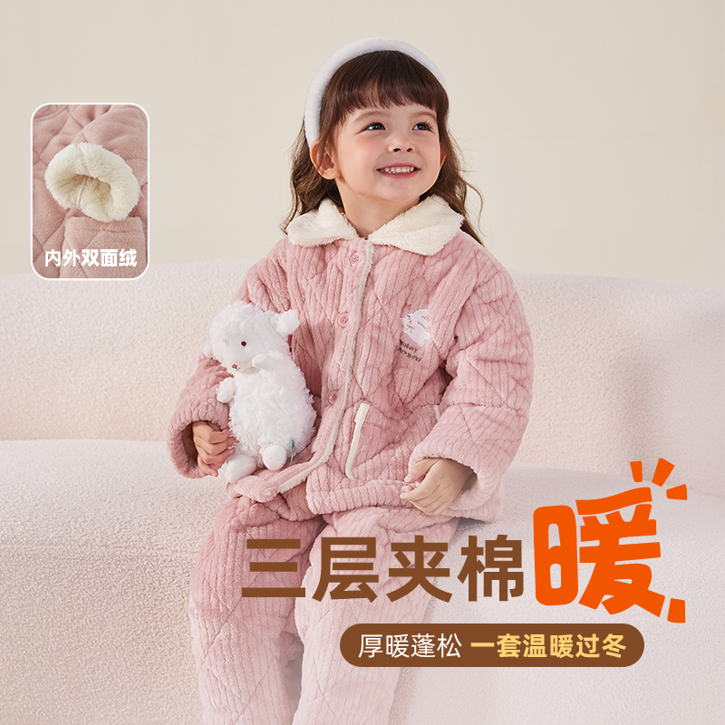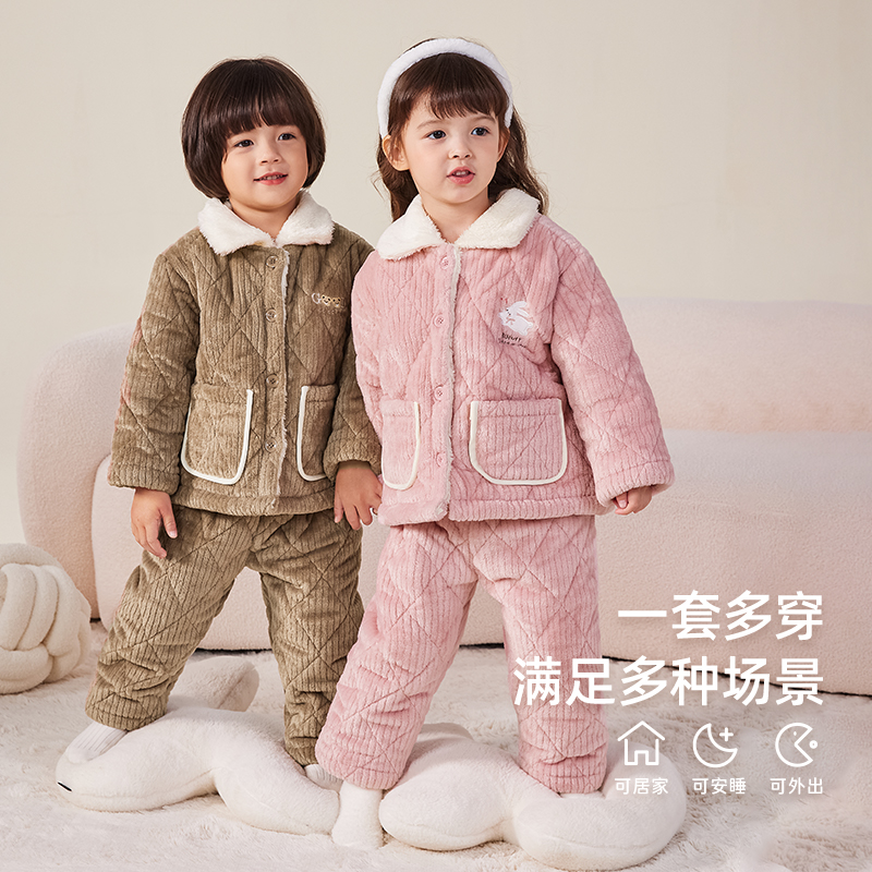 睡衣 男童三层夹棉两件套宝宝冬装 儿童冬季 家居服女童翻领加绒套装