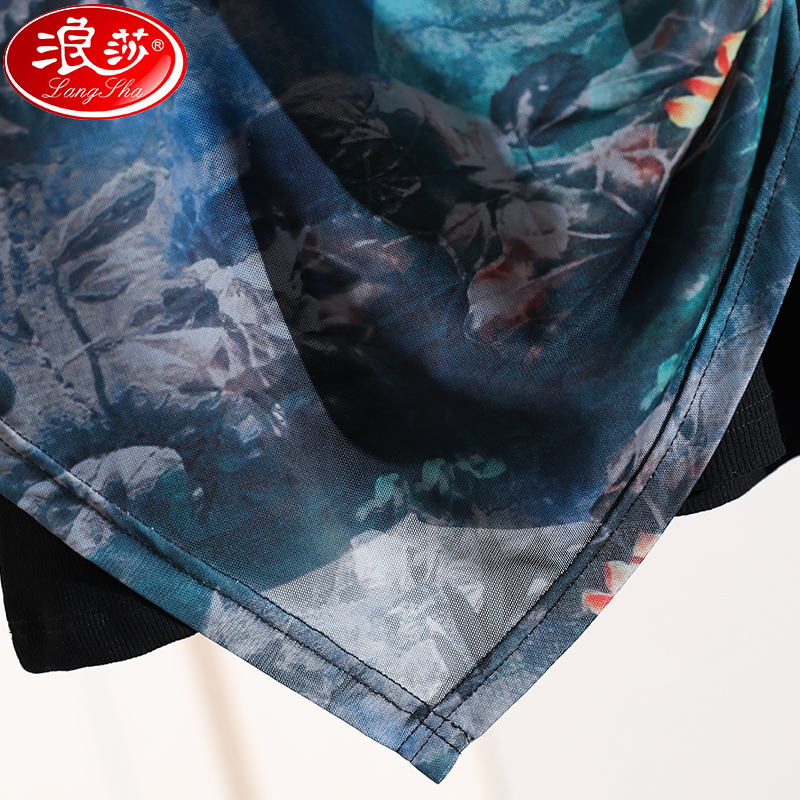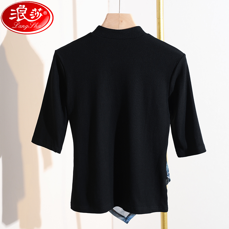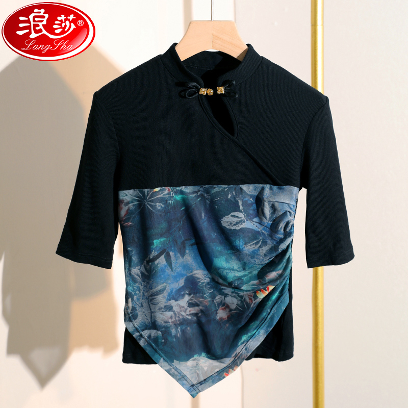 印花盘扣国风半袖 浪莎新中式 新款 2025夏季 上衣 立领T恤女五分袖