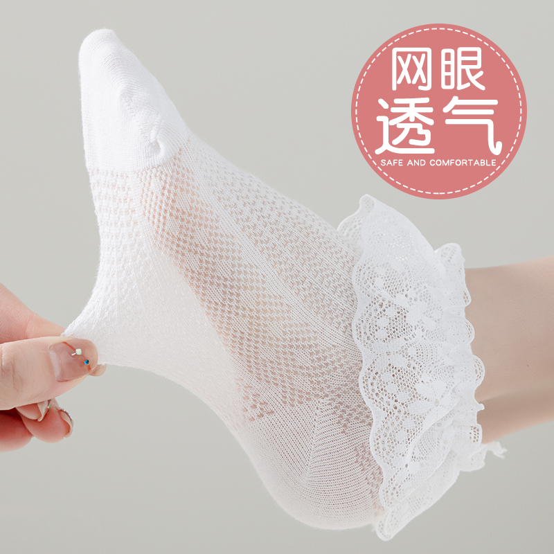 女童袜子纯棉夏季 儿童女孩公主表演蕾丝花边袜宝宝白色网眼袜 薄款