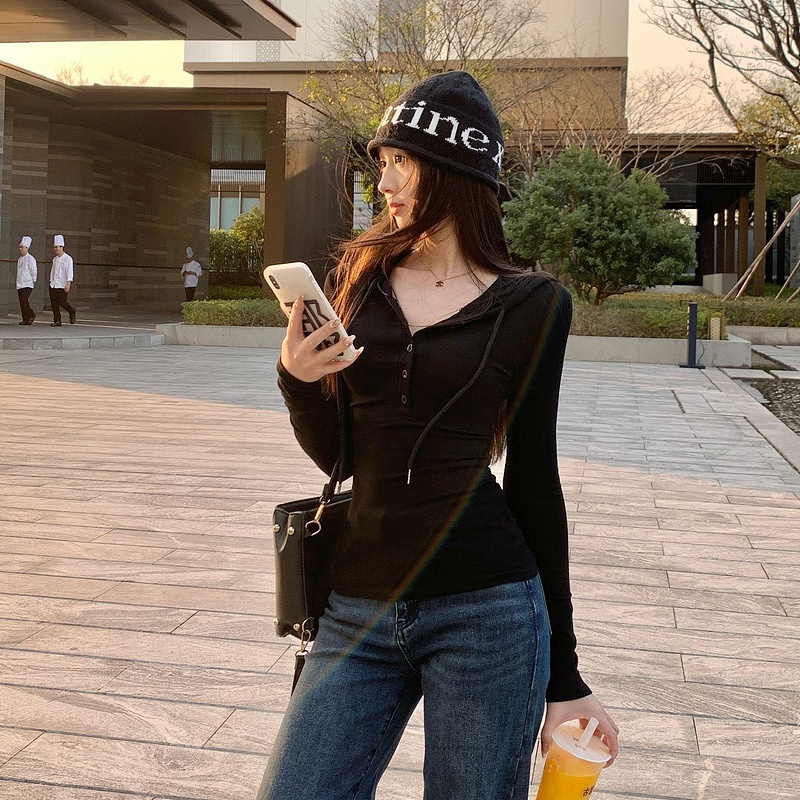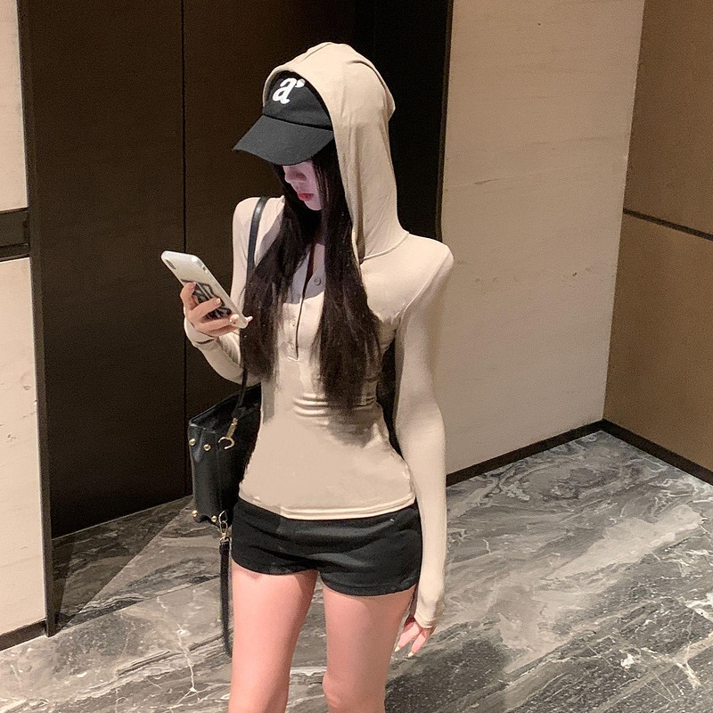 上衣女 显身材半开扣连帽卫衣收腰内搭长袖 2025春简约美式 辣妹修身