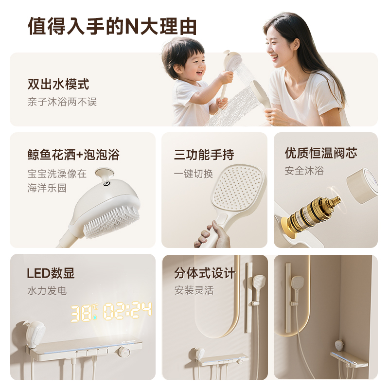 奶白色大置物台儿童手持 浪鲸卫浴恒温数显花洒套装 国补立减