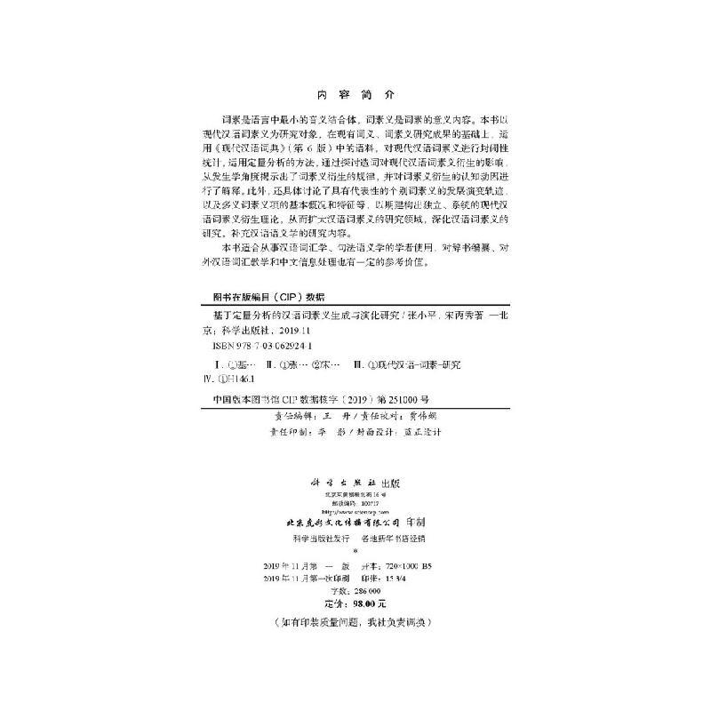 基于定量分析 科学出版 汉语词素义生成与演化研究 宋丙秀 社 张小平 全新正版