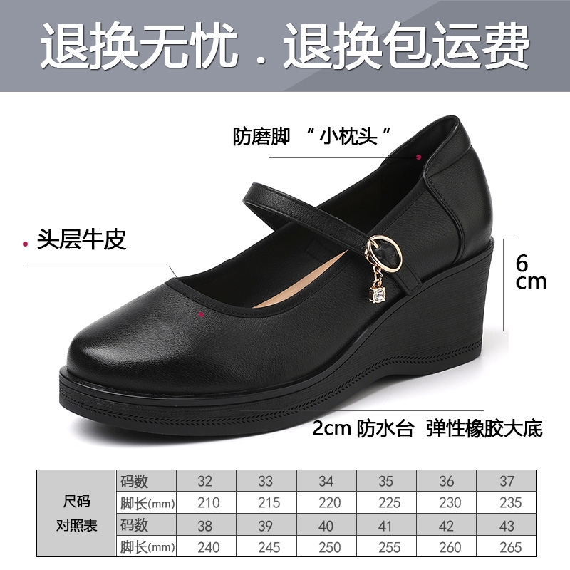女厚底玛丽珍鞋 中年高跟妈妈皮鞋 女大码 真皮一字扣带坡跟浅口单鞋