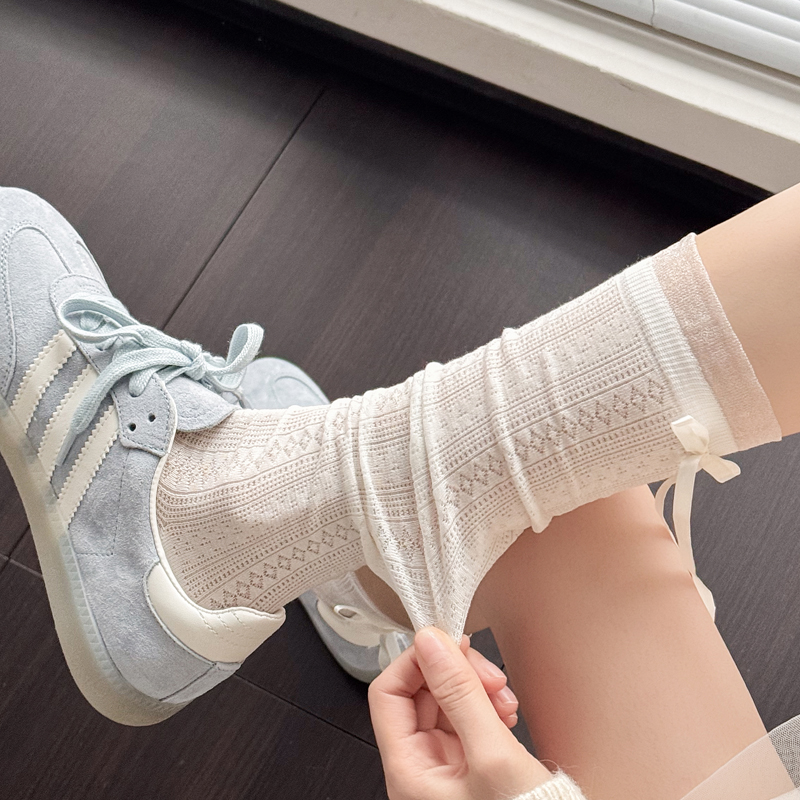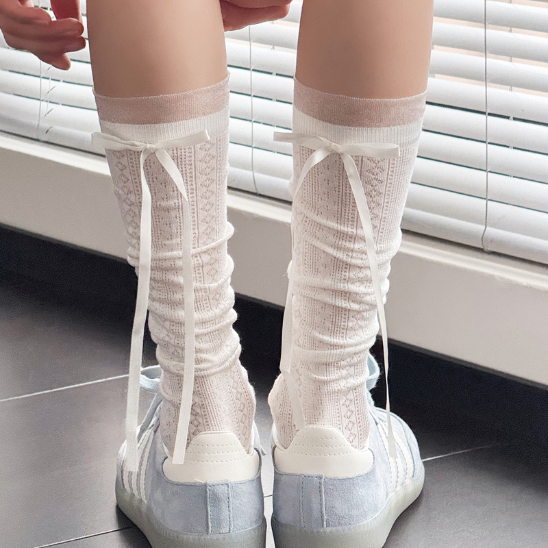 白色蝴蝶结堆堆袜子女透气简约芭蕾风miu系韩版 蕾丝小腿袜长筒袜