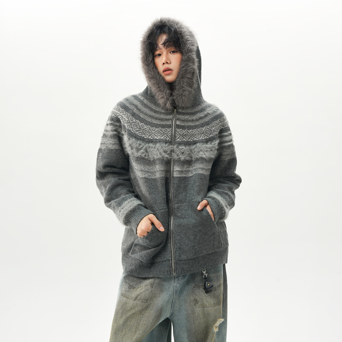 外套 毛领毛衣男女秋冬潮牌宽松情侣针织衫 美式 提花费尔岛红色开衫