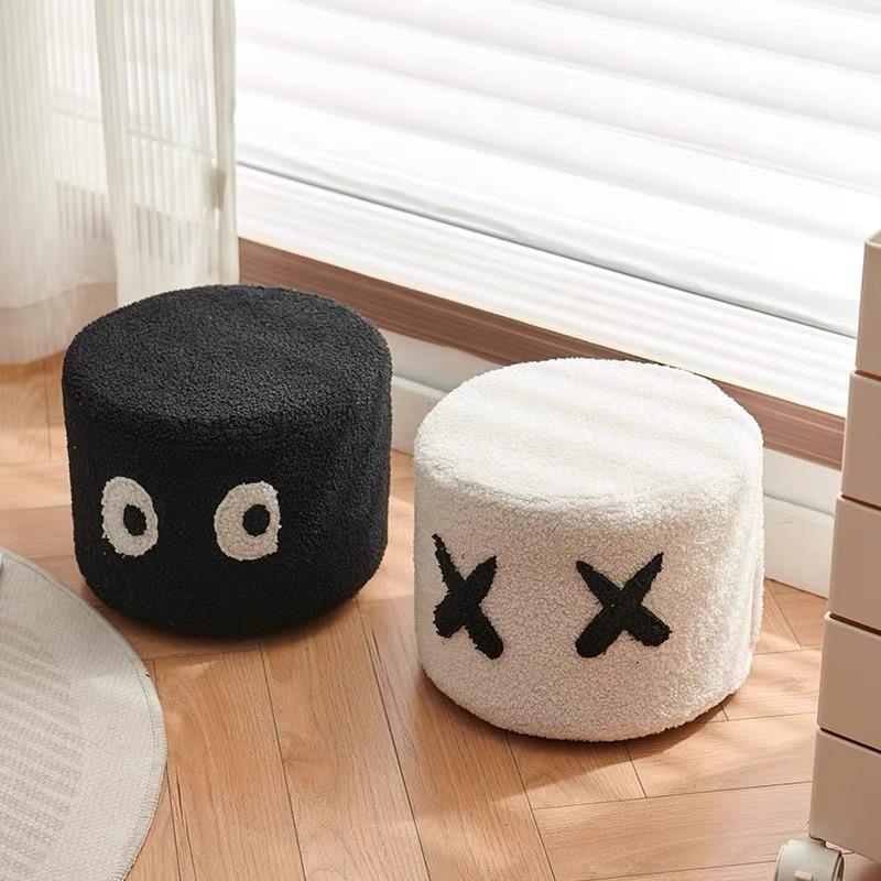 实木小凳子网红圆凳可拆洗家用板凳门口换鞋 凳创意笑脸羊羔绒矮凳