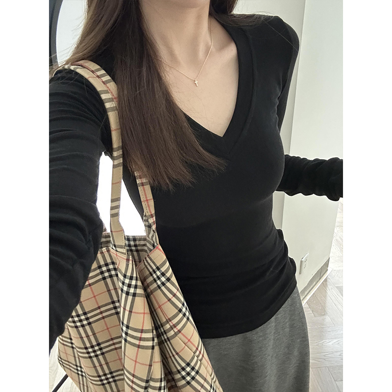 修身 打底衫 百搭上衣服 T恤女春秋内搭短款 设计感小众正肩纯棉长袖