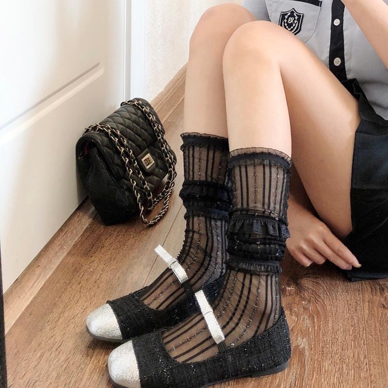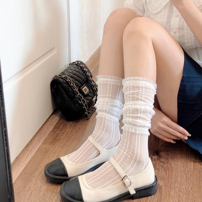 秋冬薄款 奶白色蕾丝中筒袜甜美少女花边堆堆短袜子白色小腿1013z